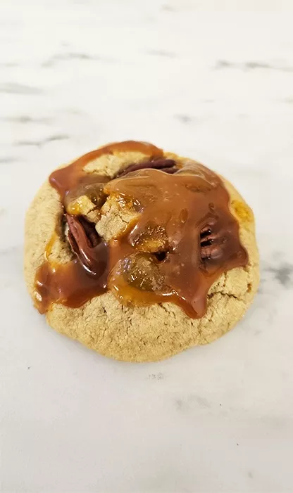 Noix de pécan, confit de pommes, caramel beurre salé.
