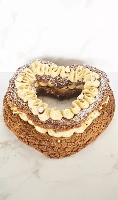 Mon Paris-Brest se compose d’une pâte à choux légère et croustillante, délicatement dorée et parsemée d’amandes effilées, garnie d’une crème pralinée onctueuse et riche en saveurs.