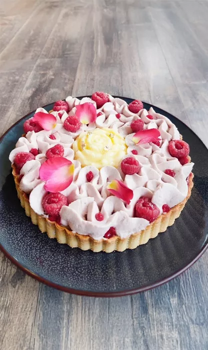 Pâte sucrée, Crémeux Citron, Confit de Framboises, Ganache montée Framboises et Framboises Fraîches