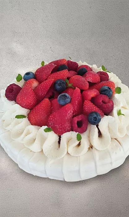 Ma Pavlova se compose d’une meringue croustillante à l’extérieur et fondante à cœur, garnie d’une chantilly onctueuse légèrement vanillée, puis sublimée par un assortiment de fruits frais de saison soigneusement sélectionnés.